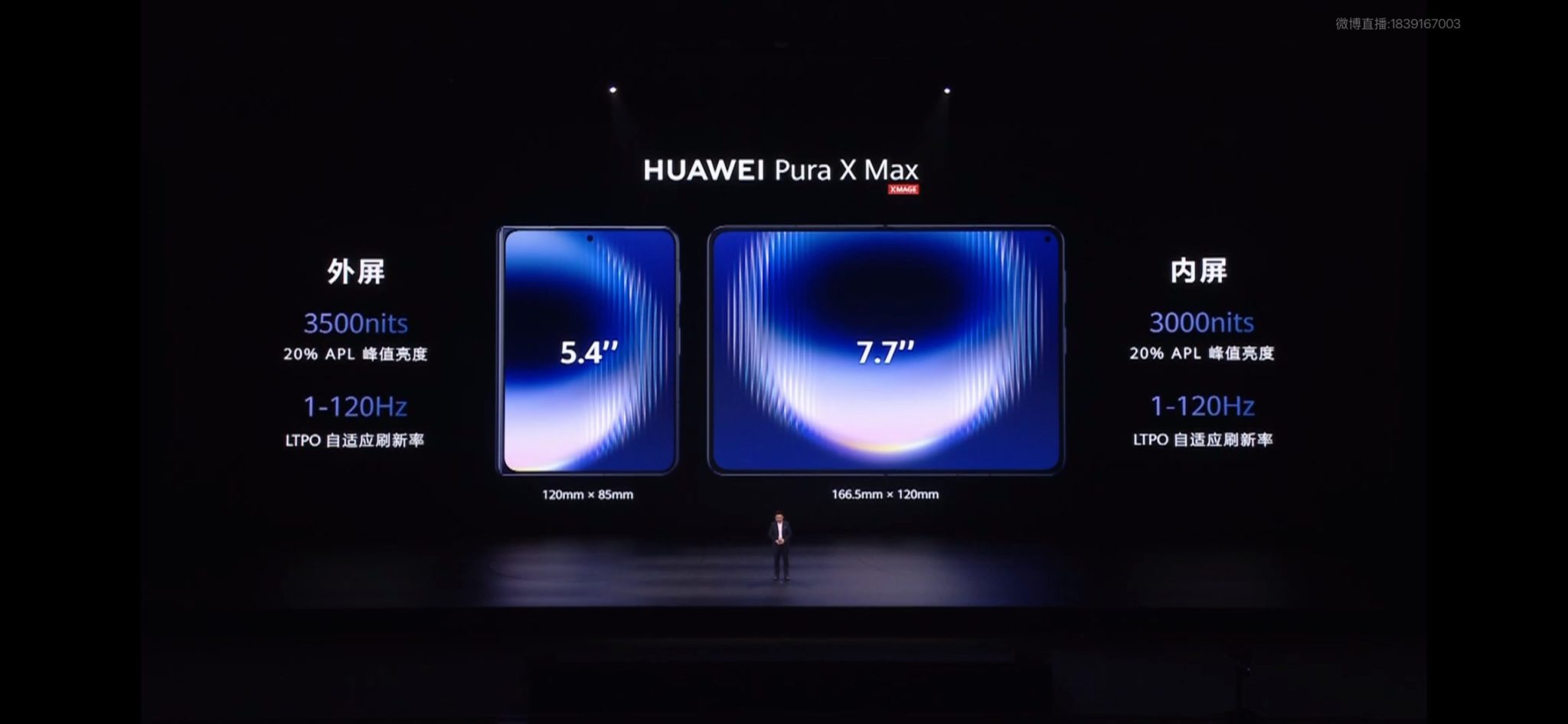 Pura X Max dilengkapi skrin luar OLED bersaiz 5.4-inci dengan puncak kecerahan sehingga 3,500 nits. Skrin dalaman pula berukuran 7.7-inci OLED yang menawarkan kecerahan maksimum 3,000 nits. Kedua-dua skrin ini menyokong kadar segar semula adaptif LTPO 1 hingga 120Hz.