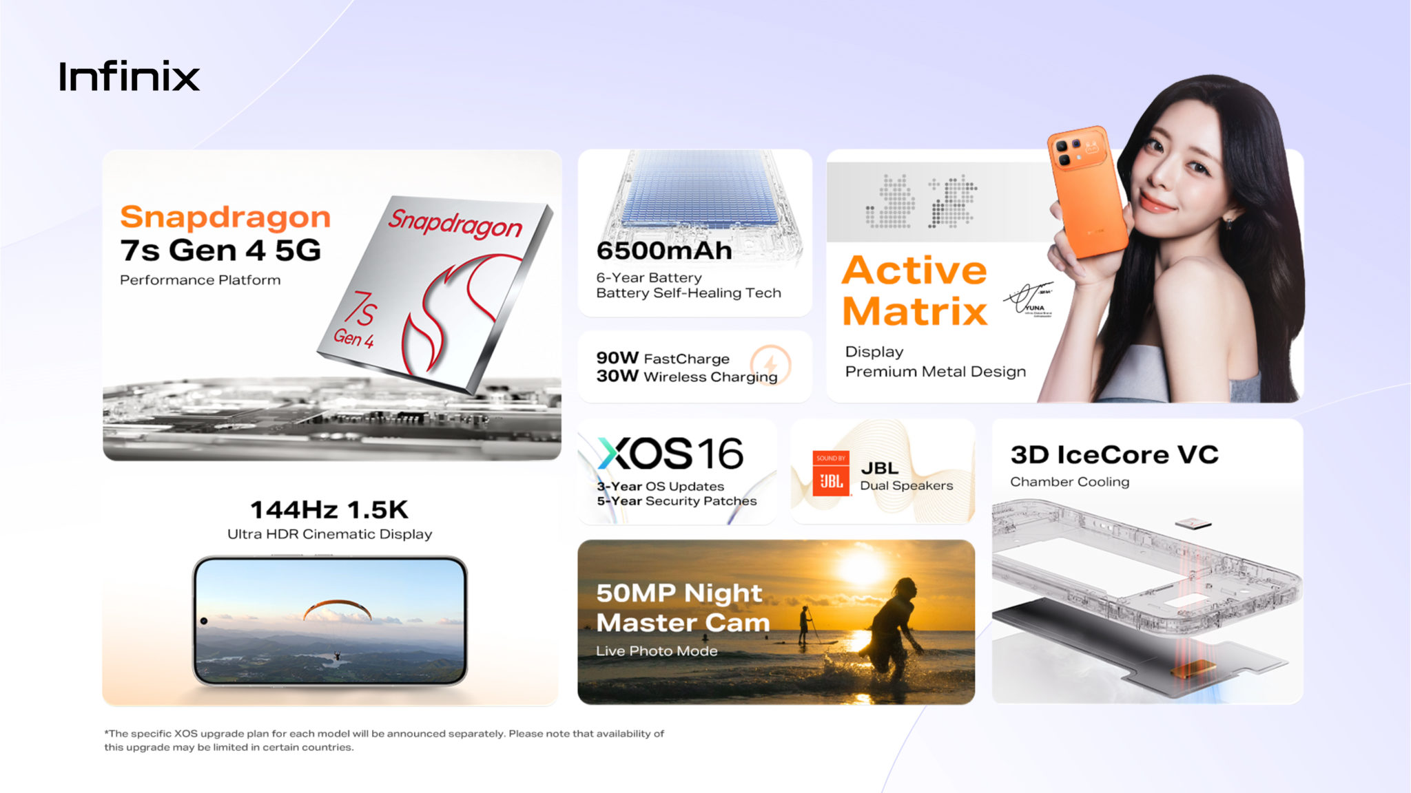 Empat pilihan warna ditawarkan termasuk Solar Orange, Deep Ocean Blue, Mocha Brown dan Mist Titanium. Lain-lain termasuk sokongan Infinix One-Tap AI, penarafan IP64, dua pembesar suara JBL dan sebagainya.