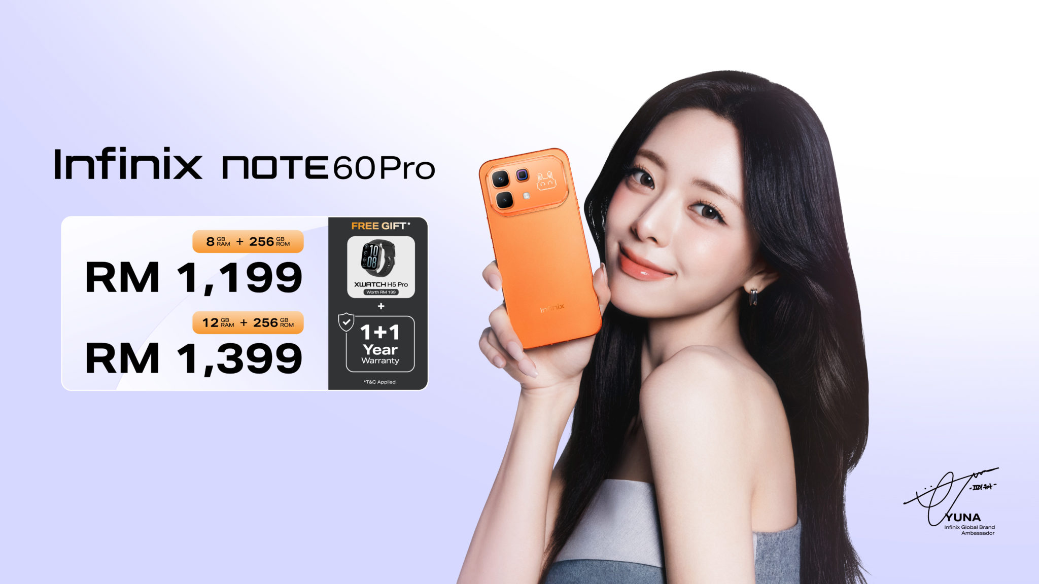 Infinix NOTE 60 Pro dijual pada harga RM1,199 (8GB+256GB) dan RM1,399 (12GB+256GB). Setiap pembelian turut didatangkan dengan XWatch H5 Pro percuma bernilai RM199, selagi stok masih ada, serta jaminan selama dua tahun.