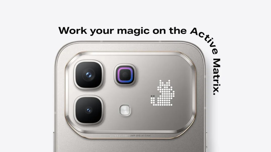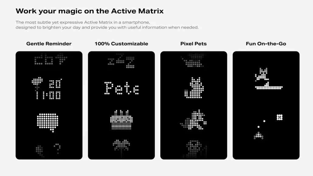 Pada bahagian belakang, terdapat Active Matrix Display dengan LED tersembunyi, yang hanya menyala apabila diaktifkan untuk paparan notifikasi pintar, animasi interaktif atau permainan mini. Pengguna juga boleh menyesuaikan paparan ini dengan tandatangan tersuai, emoji atau corak dinamik.