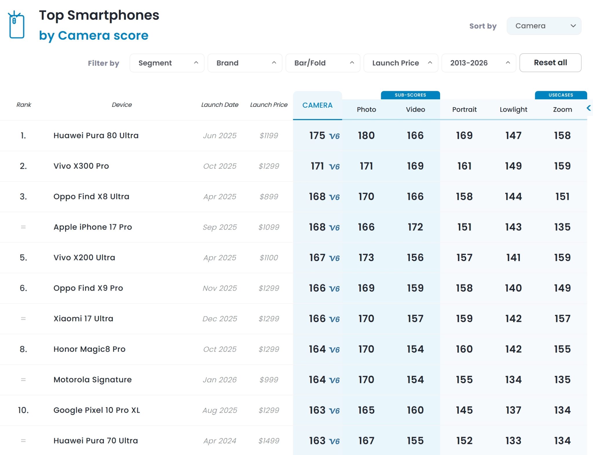 Melengkapkan senarai 10 teratas ialah Google Pixel 10 Pro XL serta Huawei Pura 70 Ultra dengan 163 mata.