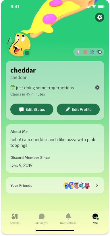 Halaman “You” ini adalah versi baharu untuk paparan profil anda supaya ia kelihatan lebih menarik dengan tambahan bahagian tetapan di bahagian atas kanan bagi mengakses tetapan akaun Discord anda.