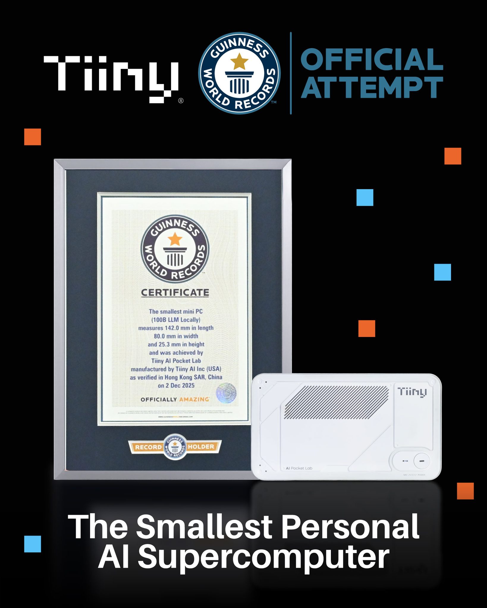 Tiiny AI mencipta sejarah apabila Guinness World Records mengiktiraf Pocket Lab sebagai superkomputer AI peribadi terkecil di dunia.