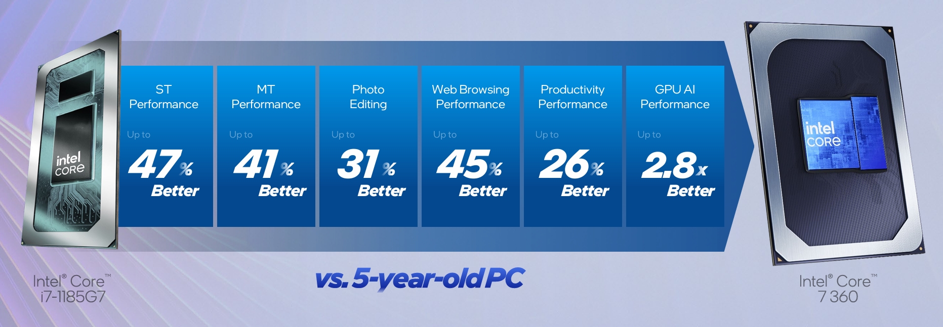 Pemproses baharu ini menawarkan peningkatan ketara berbanding PC berusia lima tahun, dengan prestasi single thread sehingga 47% lebih baik dan prestasi multi thread sehingga 41% lebih baik.