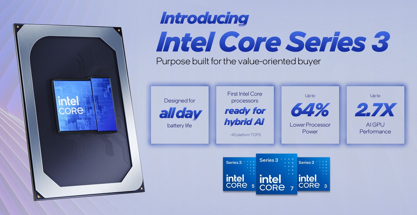 Intel hari ini mengumumkan pelancaran pemproses mudah alih terbarunya, Intel Core Series 3, yang direka khas untuk memberikan prestasi, hayat bateri, dan keupayaan AI.