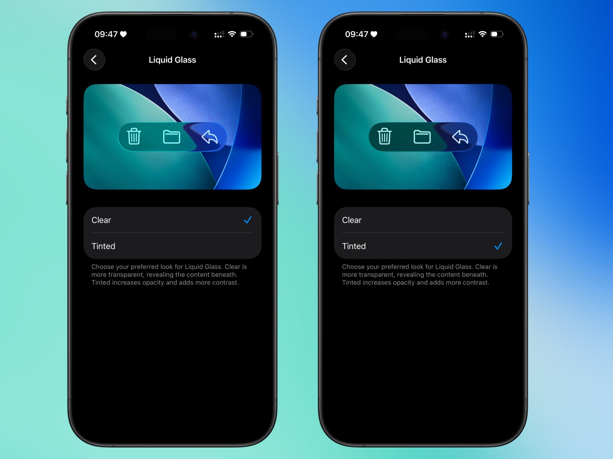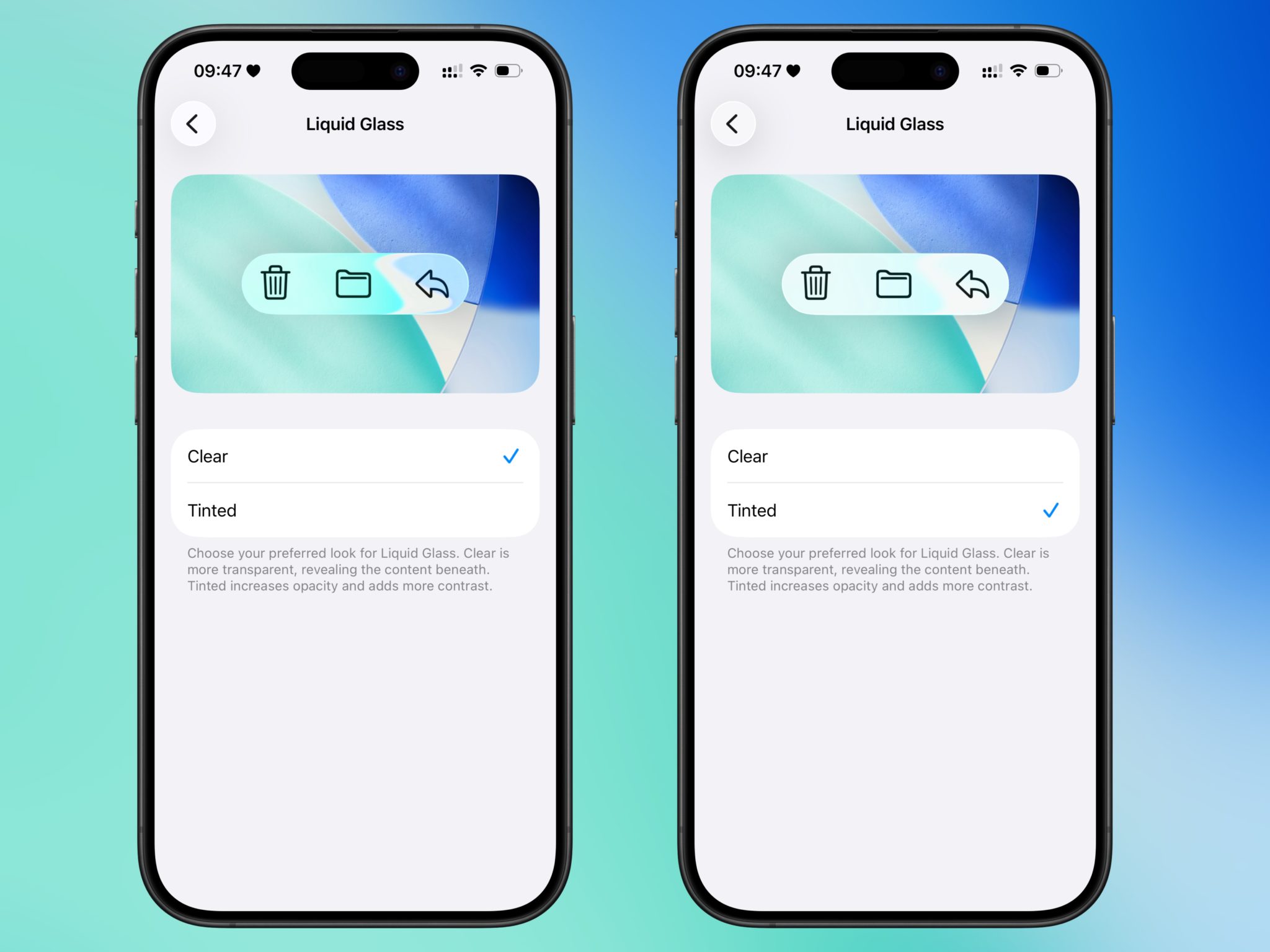 Mod Clear lebih lutsinar dan merupakan versi asal Liquid Glass yang mendedahkan latar belakang di bawah butang, bar menu serta elemen antara muka (UI) lain. Sementara itu, mod Tinted meningkatkan kelegapan Liquid Glass bagi memberikan kontras yang lebih jelas.