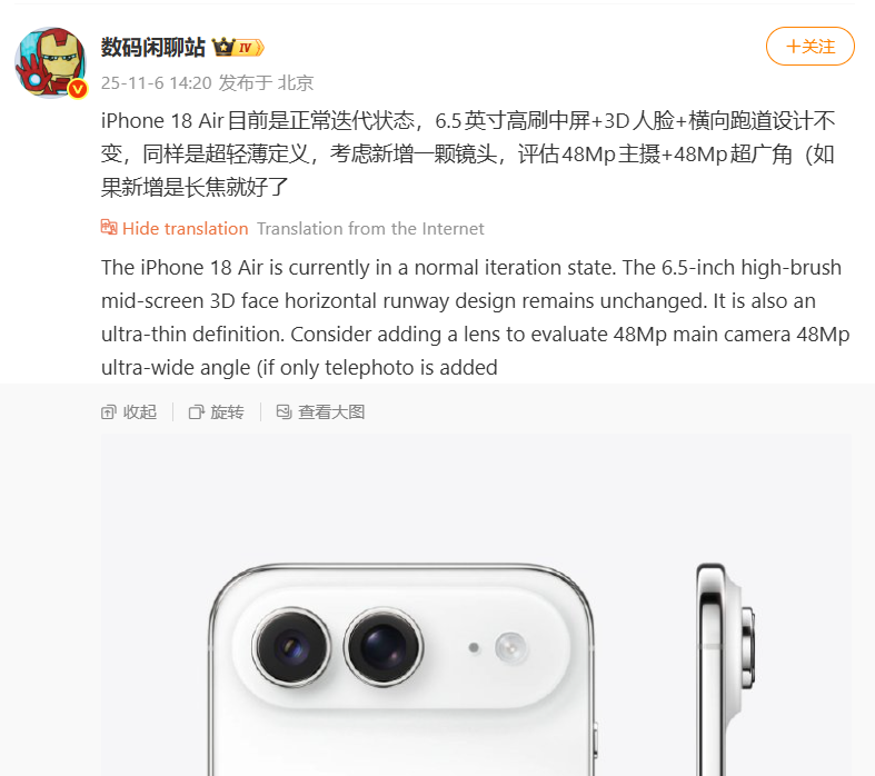 Ketika ini, beberapa komponen penting ditempatkan pada bahagian bonggol kamera iPhone Air bagi memaksimumkan ruang bateri. Jika Apple ingin menambah satu lagi kamera, perubahan besar mungkin diperlukan pada reka bentuk dalaman peranti.