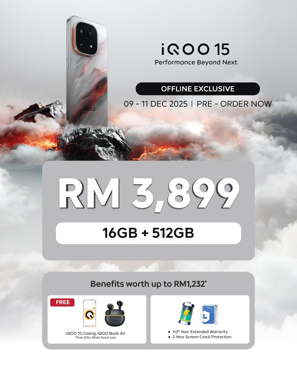 Di Malaysia, iQOO 15 ditawarkan pada harga bermula RM3,699, tersedia dalam dua warna iaitu ZEN dan Legend. Jualan dibuka secara eksklusif di Shopee, Lazada dan TikTok Shop bermula hari ini, dengan tempoh pra-tempah dari 9 hingga 11 Disember.
