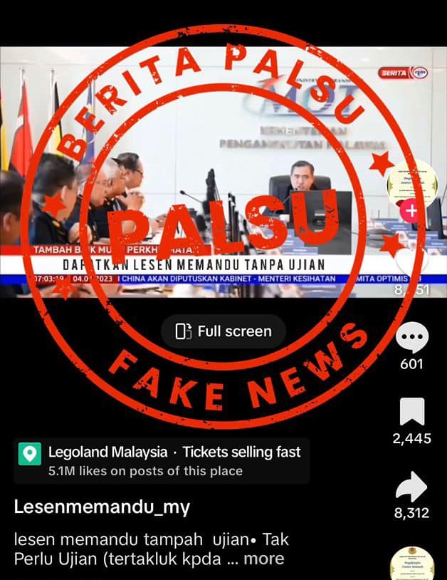 JPJ dalam satu hantaran di Facebook berkata ia menerima laporan berkaitan pengiklanan perkhidmatan ‘lesen terbang’ di platform TikTok yang menggunakan nama ‘@lesenmemandu_my’.