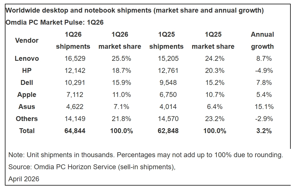 Laporan terbaru oleh Omdia menunjukkan, pasaran PC global mencatatkan pertumbuhan sederhana pada suku pertama 2026 dengan penghantaran meningkat 3.2% kepada 64.8 juta unit.