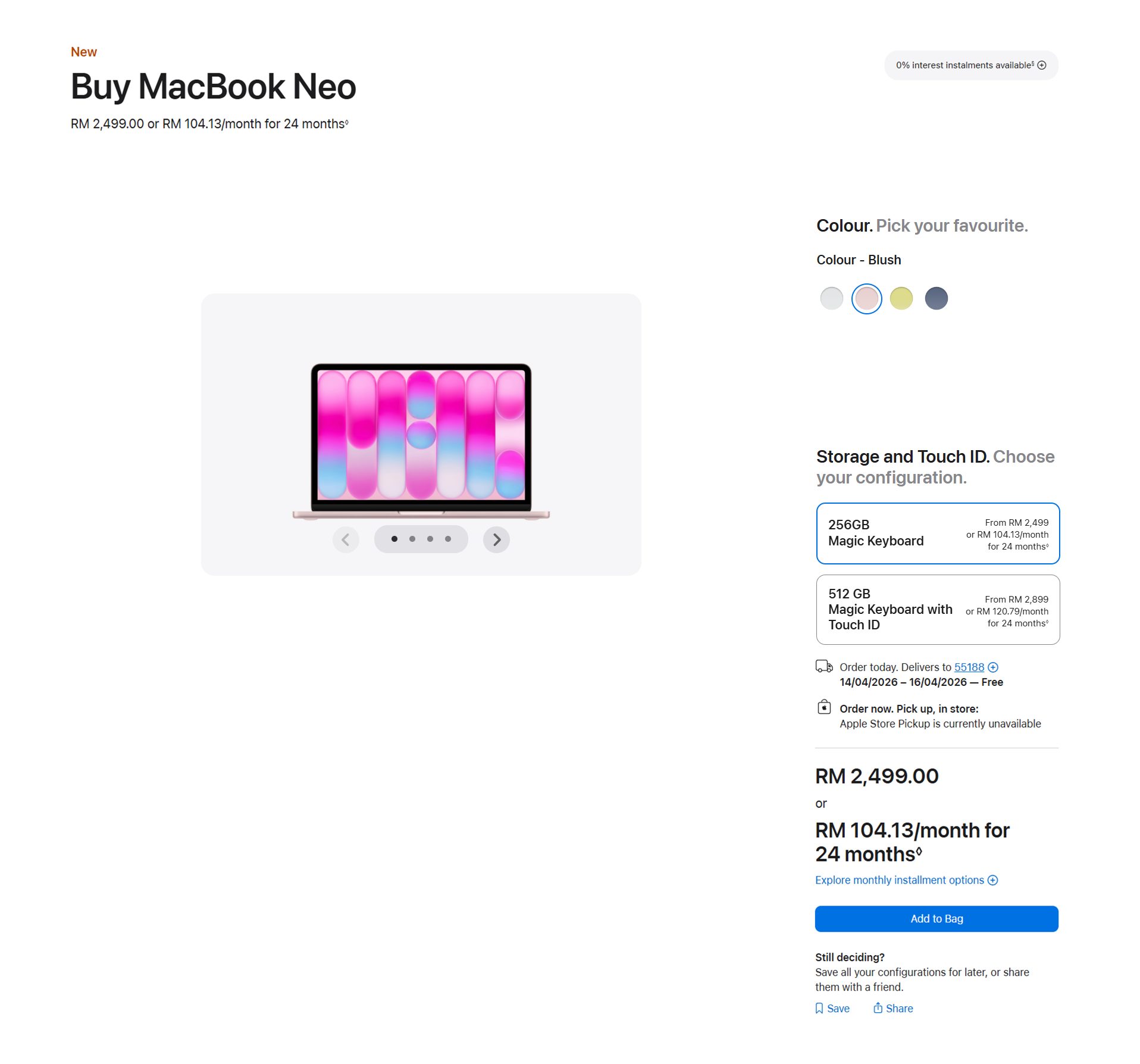 Empat pilihan warna tersedia iaitu Silver, Indigo, Blush dan Citrus. Di Malaysia, MacBook Neo ditawarkan pada harga bermula RM2,499 untuk 256GB dan RM2,899 bagi 512GB storan. Sementara itu, harga pendidikan untuk model 256GB dan 512GB masing-masing bermula pada RM2,099 dan RM2,499.