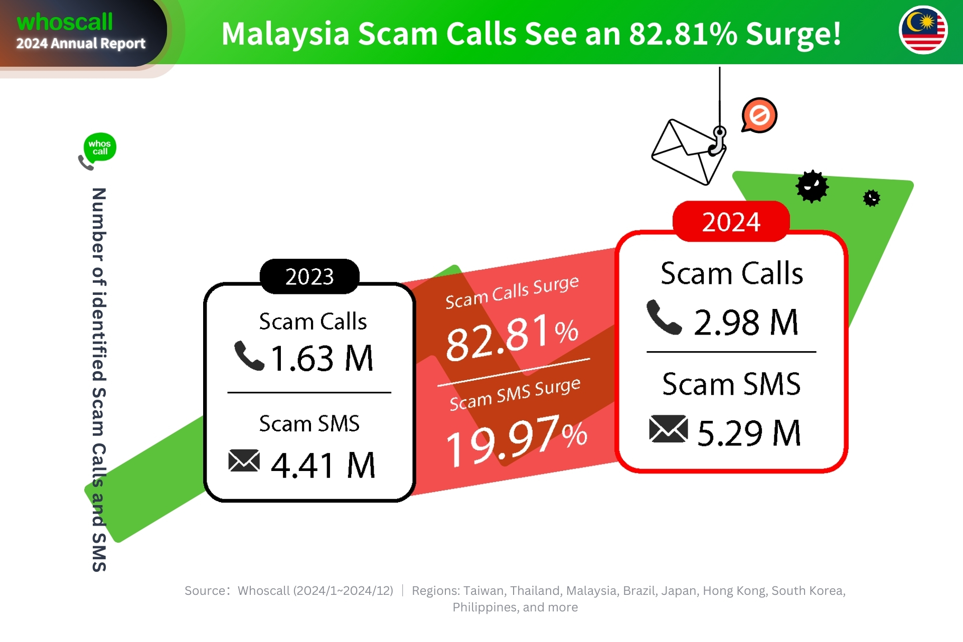 Laporan Tahunan Whoscall 2024 mendedahkan statistik ini berdasarkan analisis data penipuan yang dikumpulkan dari Januari hingga Disember 2024, merangkumi pasaran Malaysia, Taiwan, Thailand, Brazil, Jepun, Korea Selatan, Hong Kong, dan Filipina.