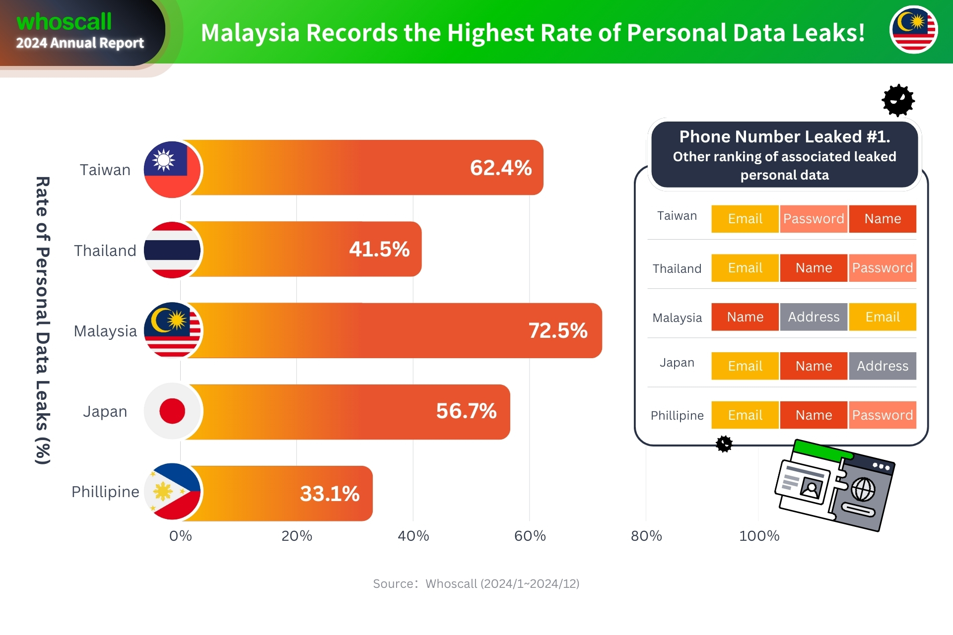Malaysia merekodkan kadar kebocoran data peribadi tertinggi dalam kalangan pasaran utama Asia, dengan 72.5% pengguna yang memeriksa status melalui ciri ID Security Whoscall mendapati maklumat mereka telah dikompromi.
