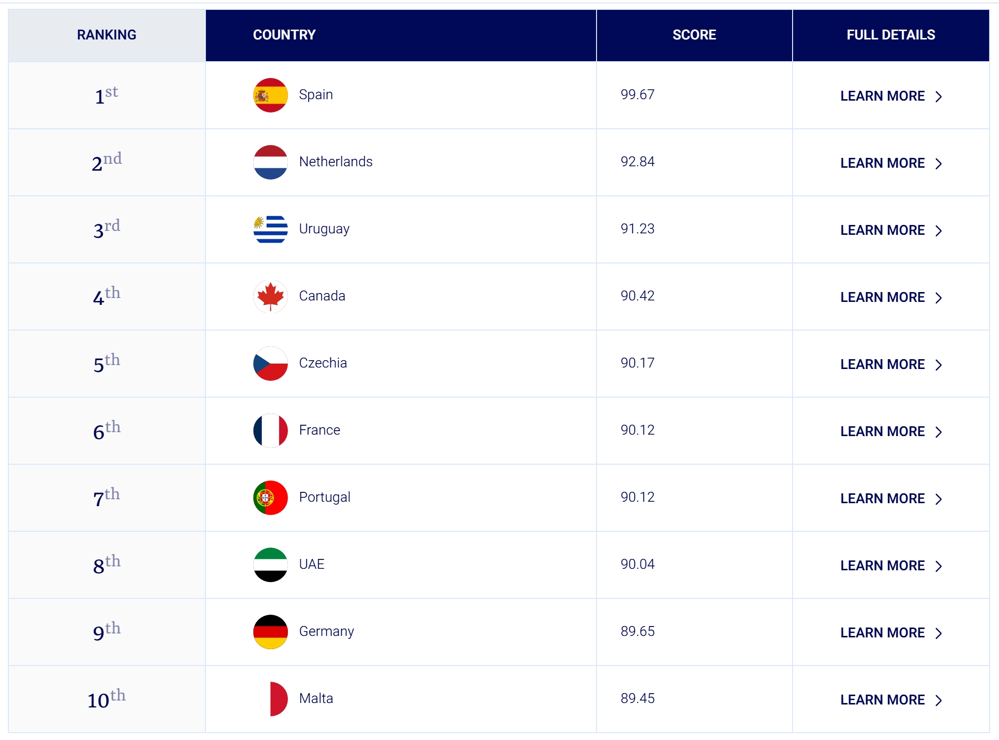 10 negara teratas lain termasuk Belanda, Uruguay, Kanada, Czechia, Portugal, Perancis, UAE, Jerman dan Malta.