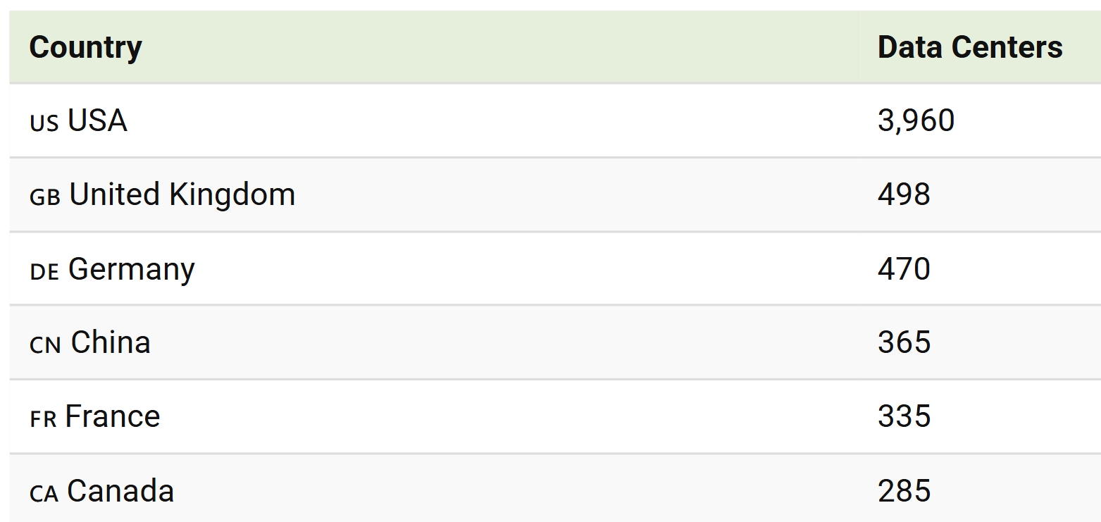 Amerika Syarikat memiliki lebih 3,960 pusat data, jumlah yang melebihi gabungan 14 negara lain di tangga teratas.