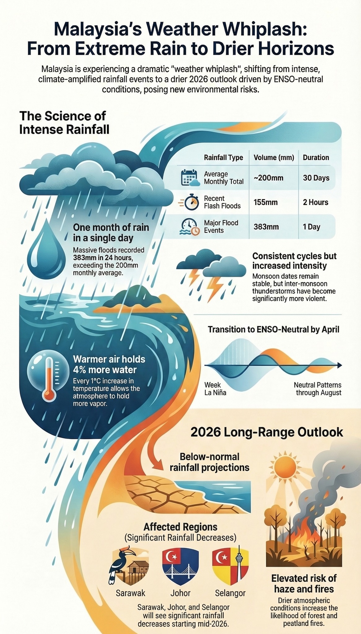 Malaysia kini sedang mengalami fenomena perubahan cuaca ekstrem yang dikenali sebagai “weather whiplash”, iaitu peralihan mendadak daripada hujan lebat kepada keadaan lebih kering.