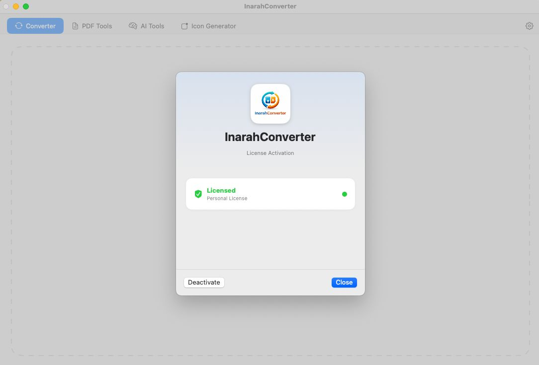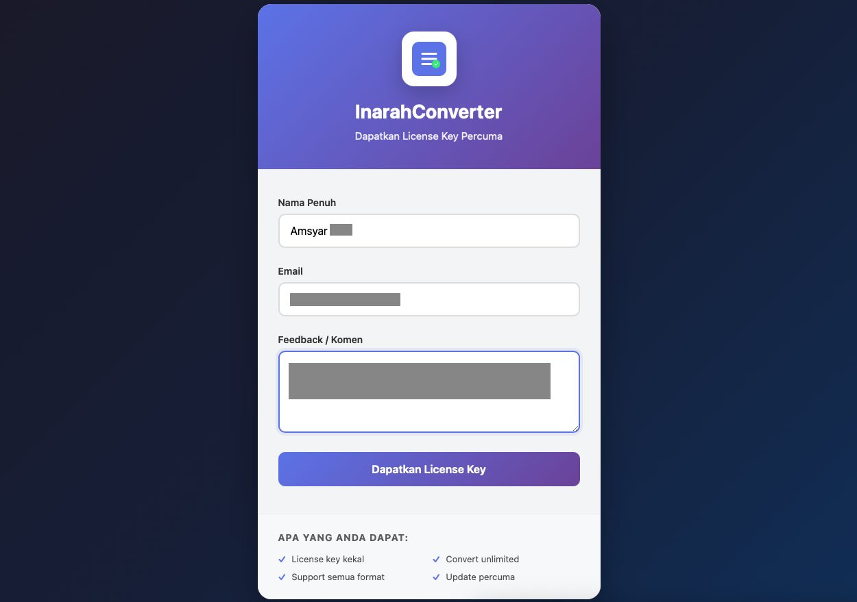 Pengguna Mac boleh memuat turun InarahConverter dan mendapatkan License Key percuma dengan memberikan maklum balas bagi penambahbaikan aplikasi melalui laman alinarah.com.