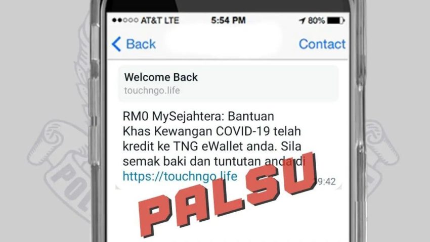 Suruhanjaya Komunikasi dan Multimedia Malaysia (MCMC) melalui kenyataan media hari ini, mengingatkan orang ramai agar berwaspada dan tidak terpedaya jika telah menerima SMS daripada ID Penghantar ‘GOV’ menggunakan nama organisasi MySejahtera yang memberitahu pengguna bahawa bantuan khas kewangan telah dikreditkan ke akaun Touch N Go (TNG) eWallet mereka.