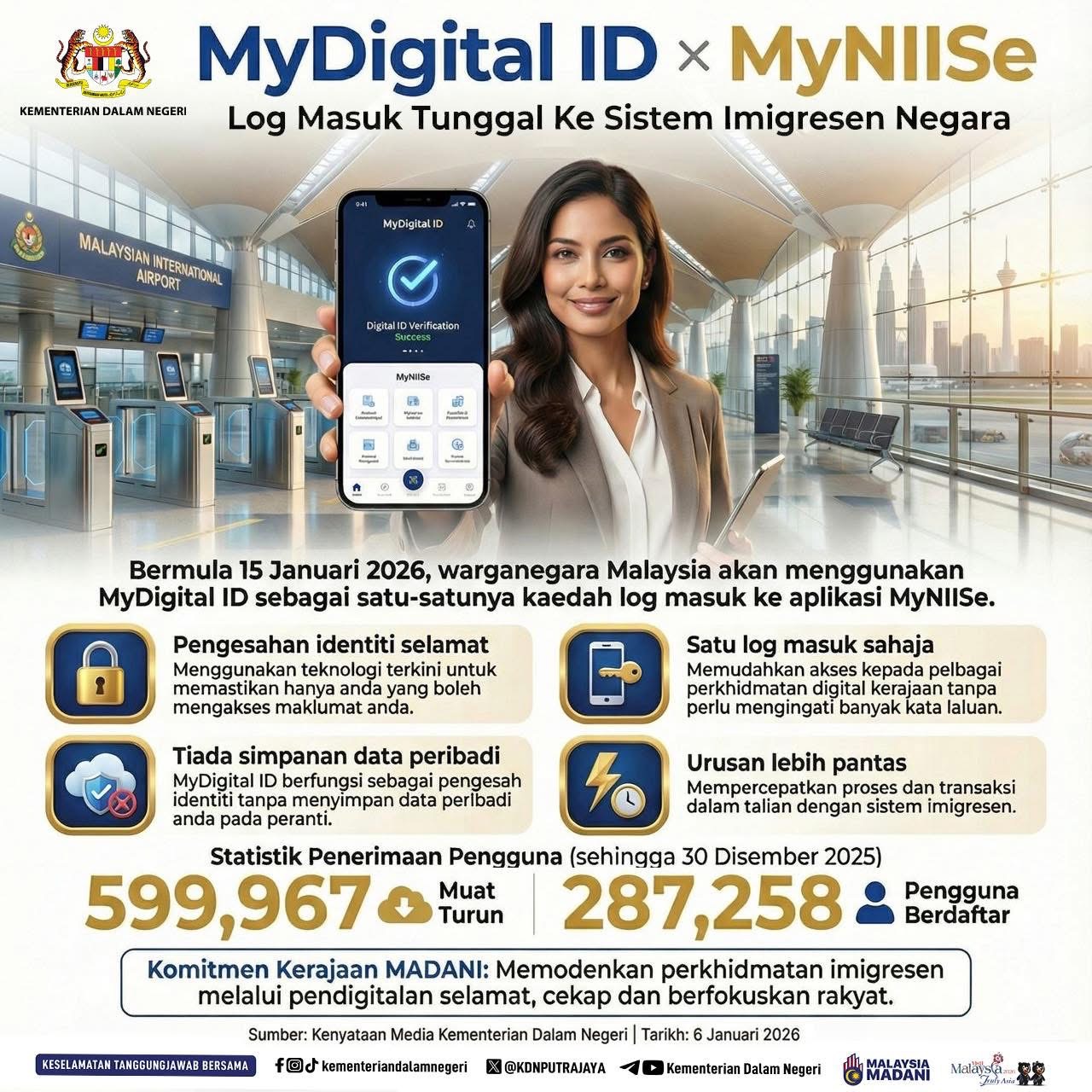Kementerian Dalam Negeri (KDN) akan memulakan penggunaan MyDigital ID sebagai platform log masuk tunggal bagi warganegara Malaysia yang menggunakan aplikasi MyNIISE, berkuat kuasa 15 Januari 2026.