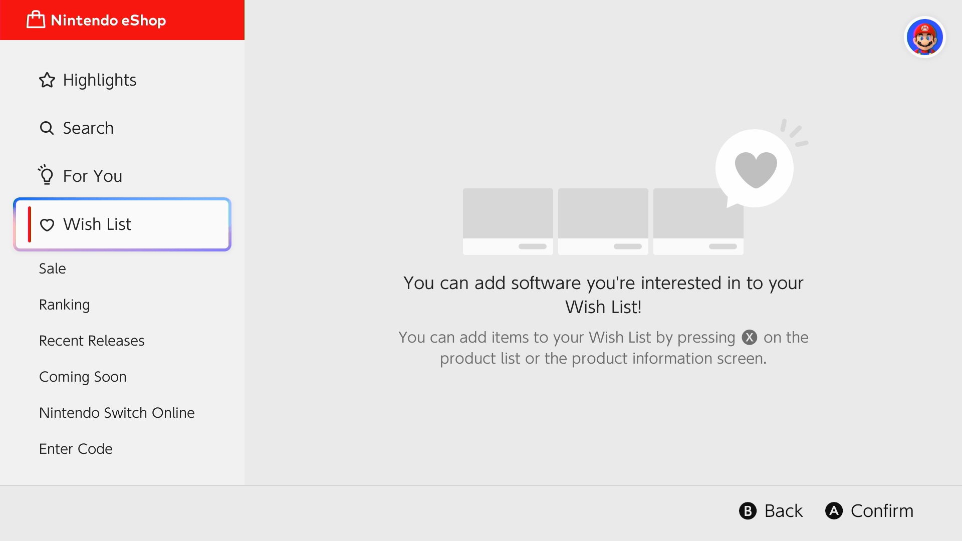 Halaman Nintendo eShop menampilkan pelbagai ciri seperti “Highlights” untuk permainan terpilih, carian permainan mengikut tajuk atau genre, For You untuk cadangan permainan berdasarkan minat, Wish List, serta kedudukan permainan paling popular.