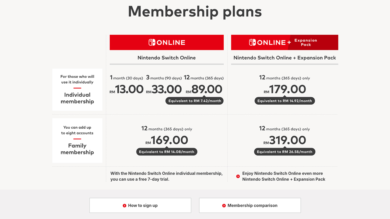Di Malaysia, keahlian Nintendo Switch Online ditawarkan pada harga RM13 (30 hari), RM33 (90 hari) dan RM89 (12 bulan) untuk Individu. Bagi pelan Family yang boleh menampung sehingga 8 akaun, harga tahunan ialah RM169.