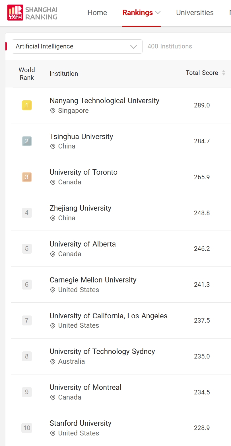 Senarai 10 teratas turut menampilkan University of Toronto, University of Alberta, Carnegie Mellon, UCLA, University of Technology Sydney, University of Montreal dan Stanford.