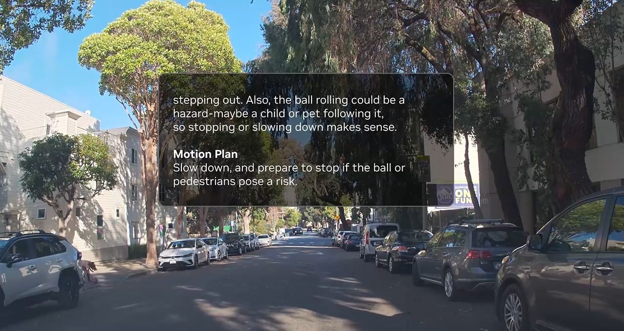 Keunikan Alpamayo-R1 ialah ia “berfikir secara lantang”, menjelaskan setiap tindakan seperti mengubah haluan apabila mengesan laluan basikal.
