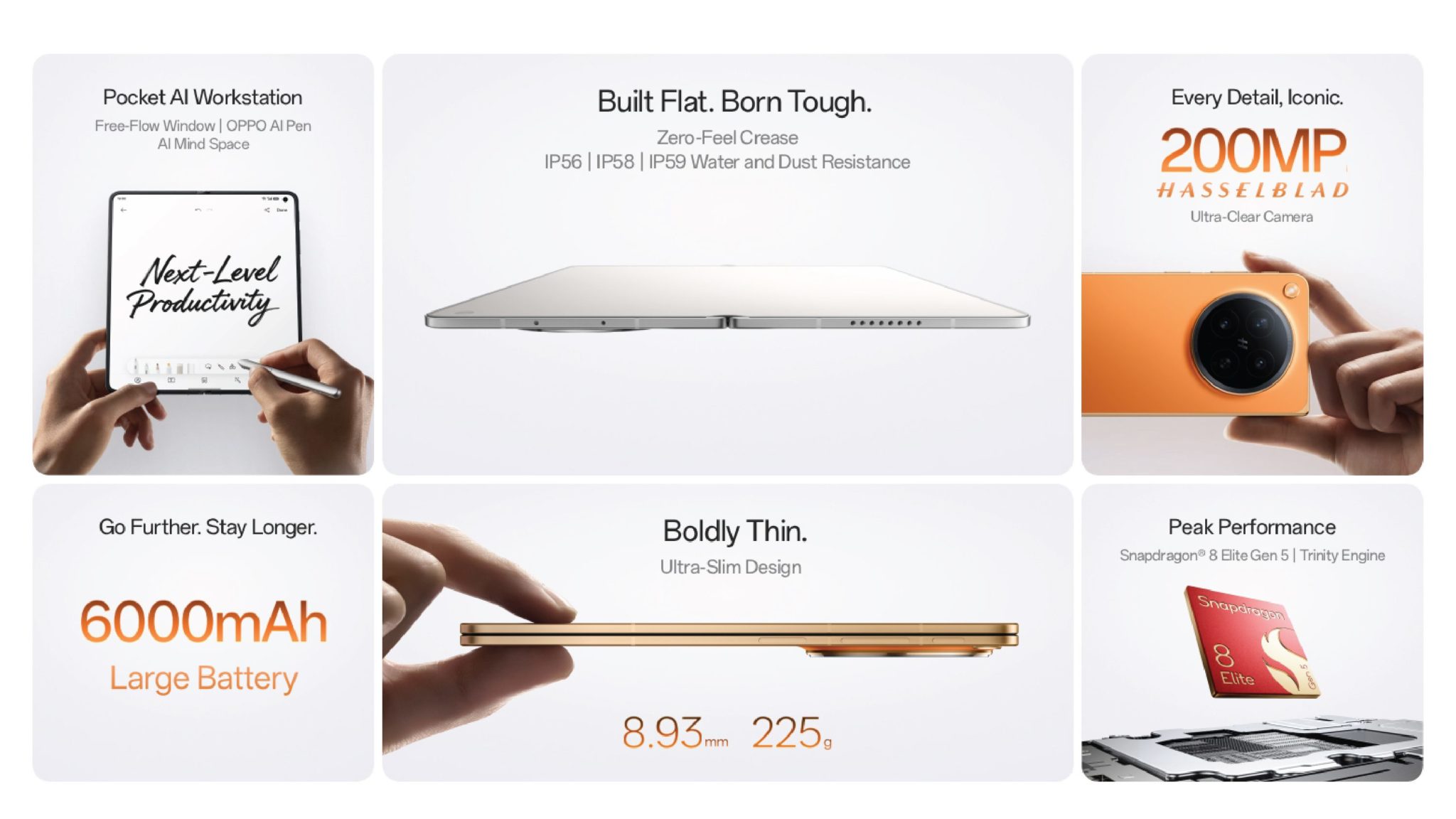 OPPO Find N6 akan dijual di Malaysia bermula 20 Mac 2026 pada harga RM8,699 untuk versi 16GB + 512GB. Dua pilihan warna tersedia iaitu Blossom Orange dan Stellar Titanium.