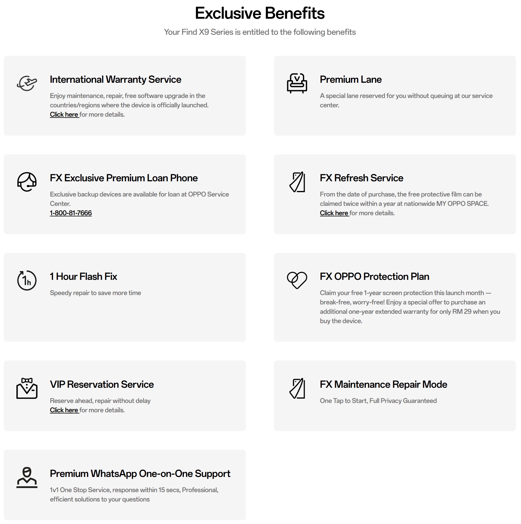 Melalui One-on-One Support, pengguna Find X9 boleh berhubung terus dengan “service butler” berpengalaman melebihi lima tahun untuk rundingan produk, bantuan teknikal dan penjadualan pembaikan.