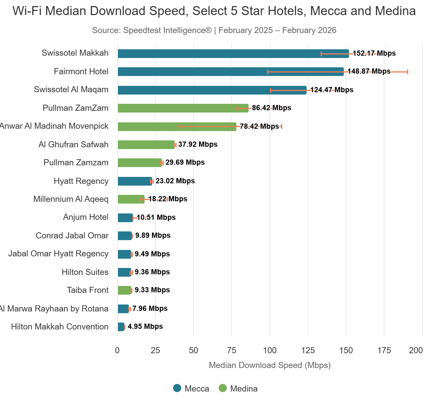Sebagai contoh, Ookla merekodkan kelajuan Wi-Fi sehingga 152 Mbps di Swissôtel Makkah, manakala Fairmont Hotel pula mencapai 149 Mbps dan Swissôtel Al Maqam dengan 124 Mbps.