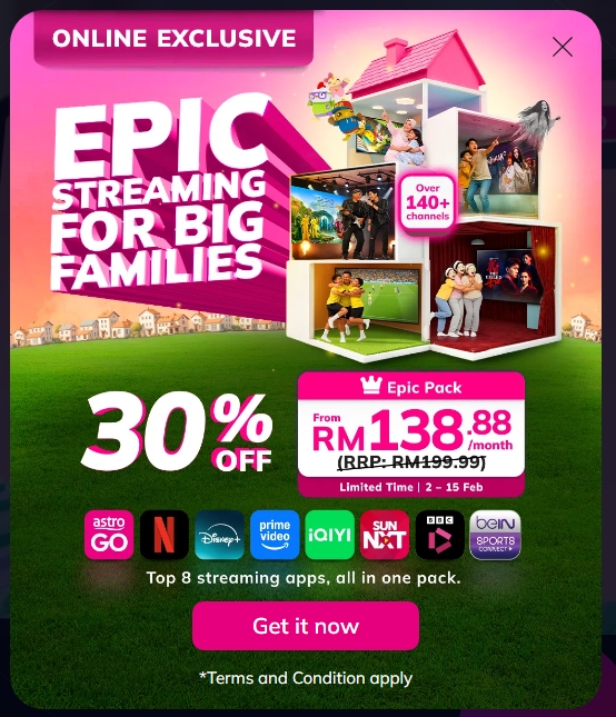 Pek ini menghimpunkan filem, siri, sukan dan hiburan kanak-kanak, serta akses kepada 8 aplikasi penstriman popular seperti Netflix, Disney+, Prime Video, iQIYI dan beIN Sports dan banyak lagi — semuanya dalam satu platform.