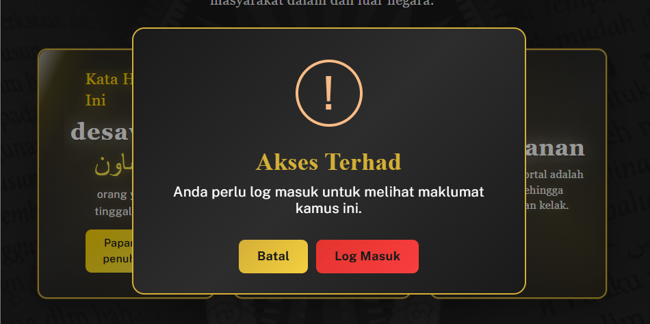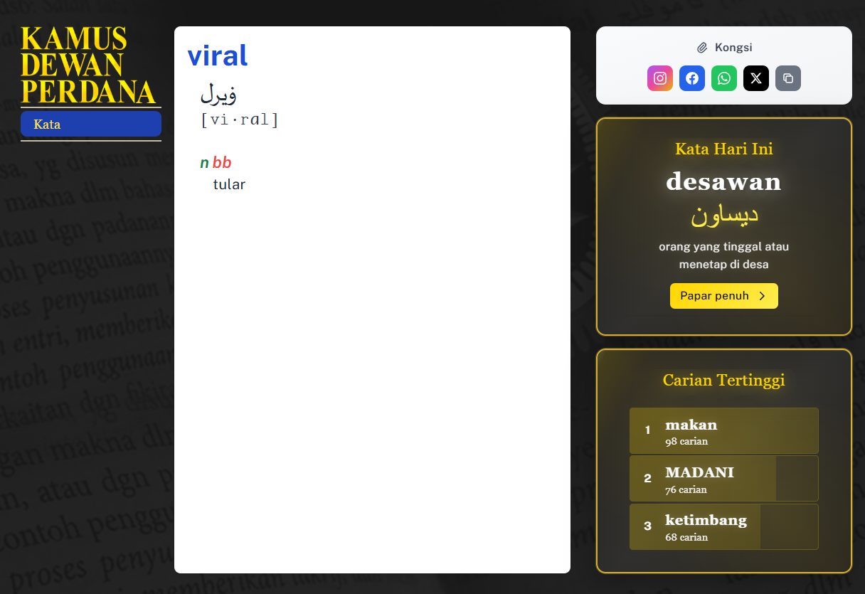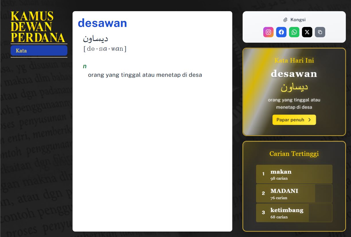 Dari segi fungsi, pengguna boleh melihat ciri seperti Kata Hari Ini dan Carian Tertinggi. Namun begitu, untuk mengakses paparan penuh sesuatu entri, pengguna perlu log masuk terlebih dahulu. Malah, terdapat juga beberapa kata tertentu yang memerlukan log masuk sebelum hasil carian dipaparkan – contohnya perkataan “viral”.