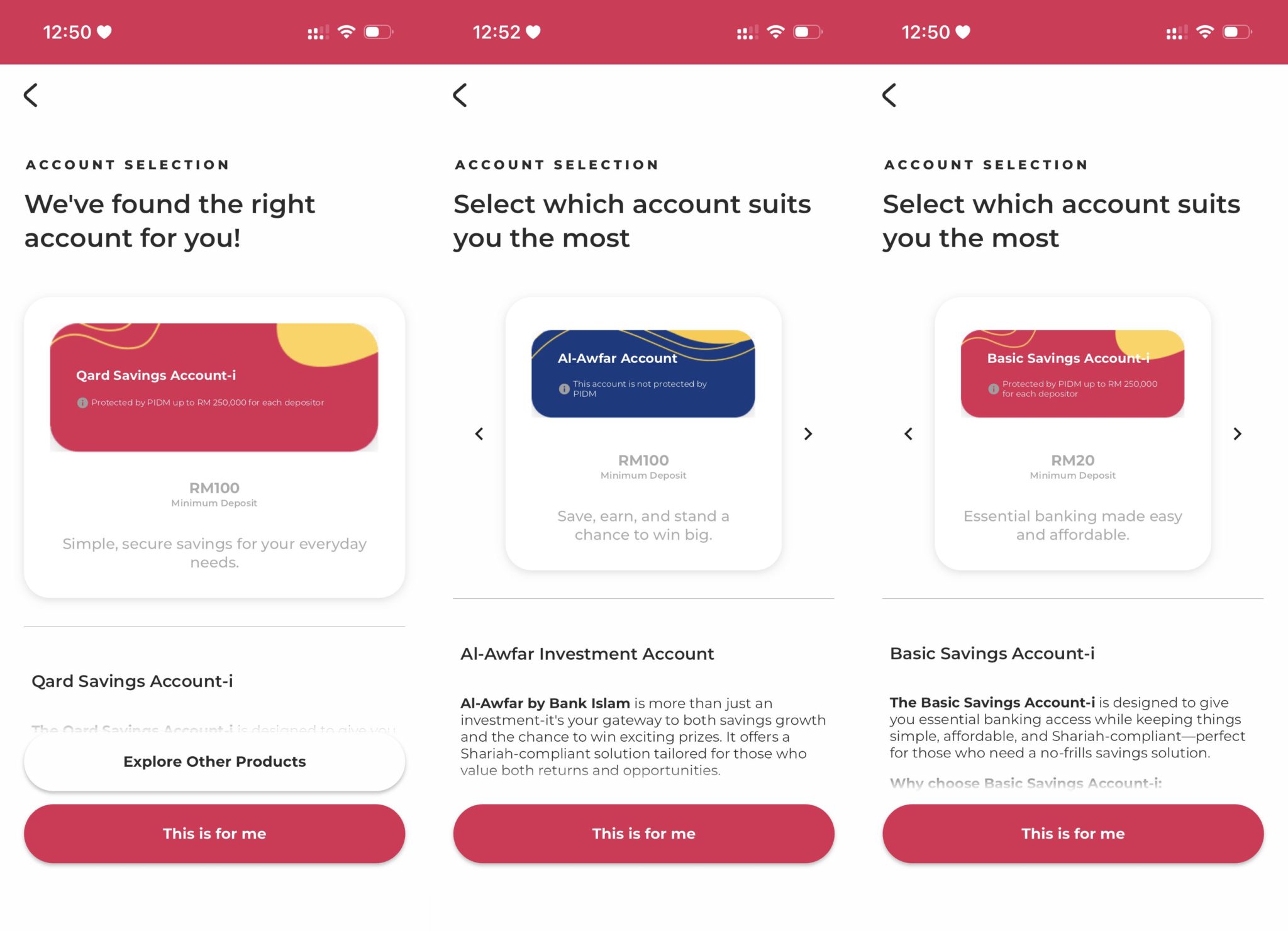 Melalui BIMB Mobile, pengguna boleh memilih jenis akaun yang sesuai dengan keperluan masing-masing. Antara pilihan yang ditawarkan termasuk Qard Savings Account-i dengan deposit RM100 dan Basic Savings Account-i dengan deposit RM20.
