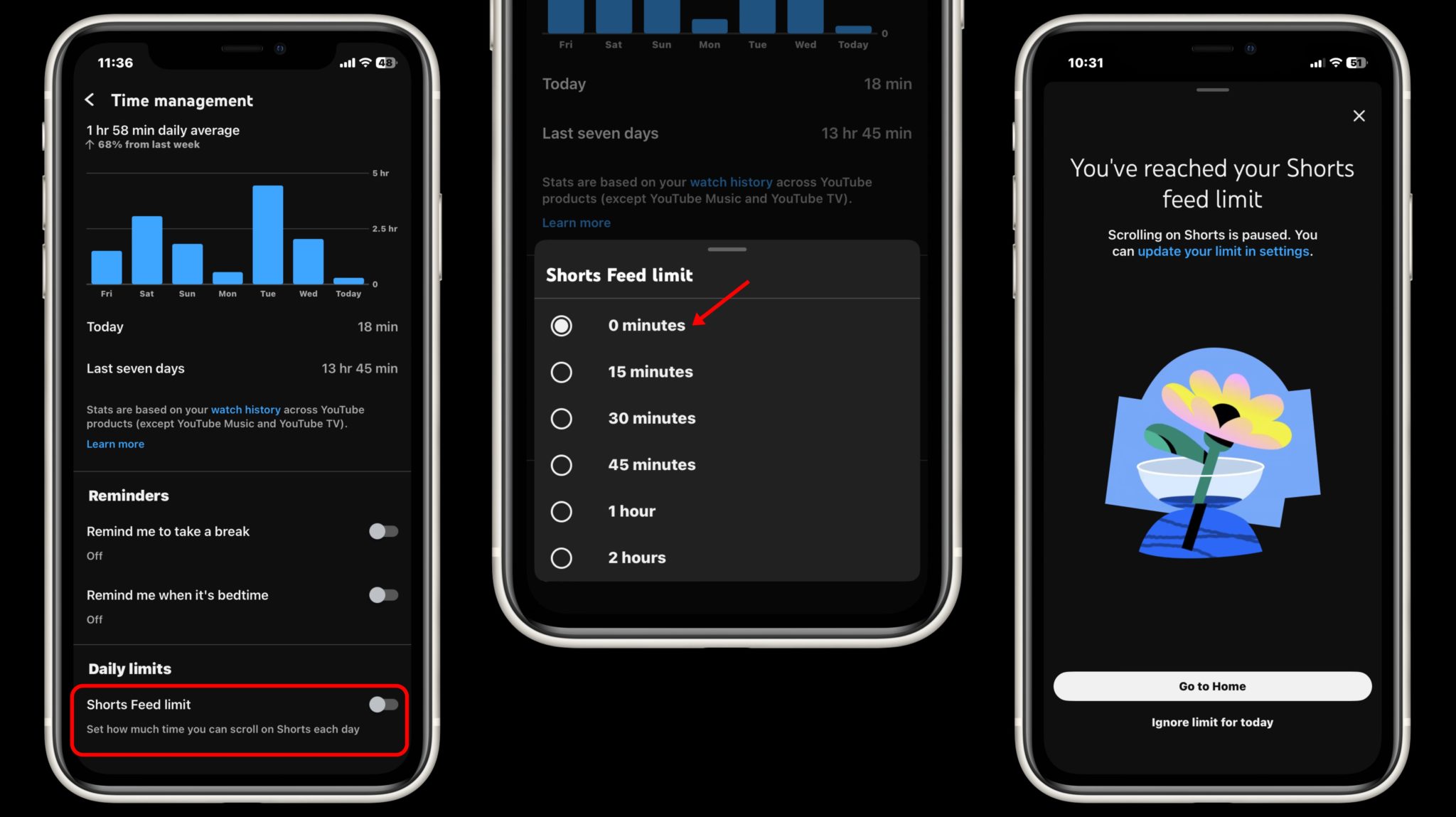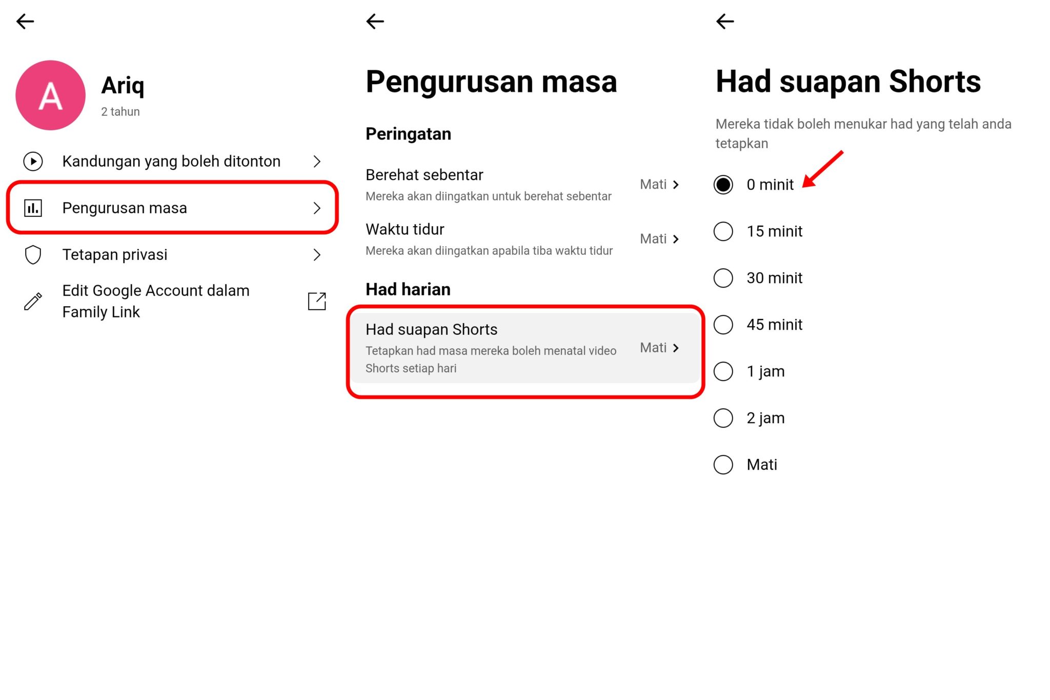 Cara tetapkan had harian Shorts kepada 0 minit