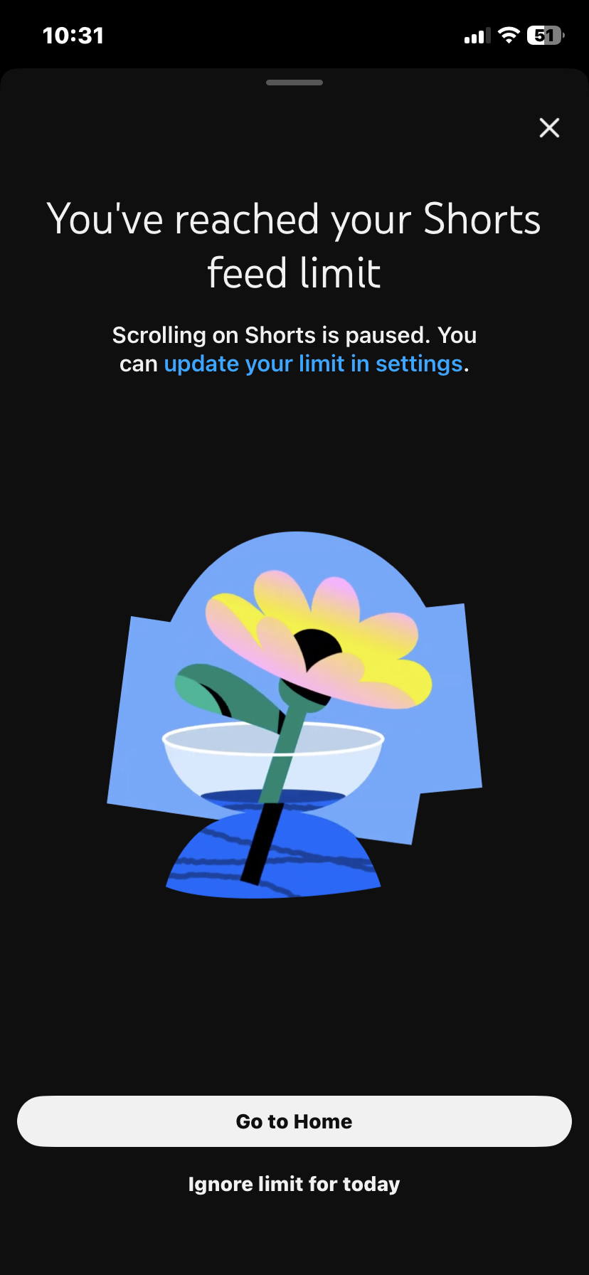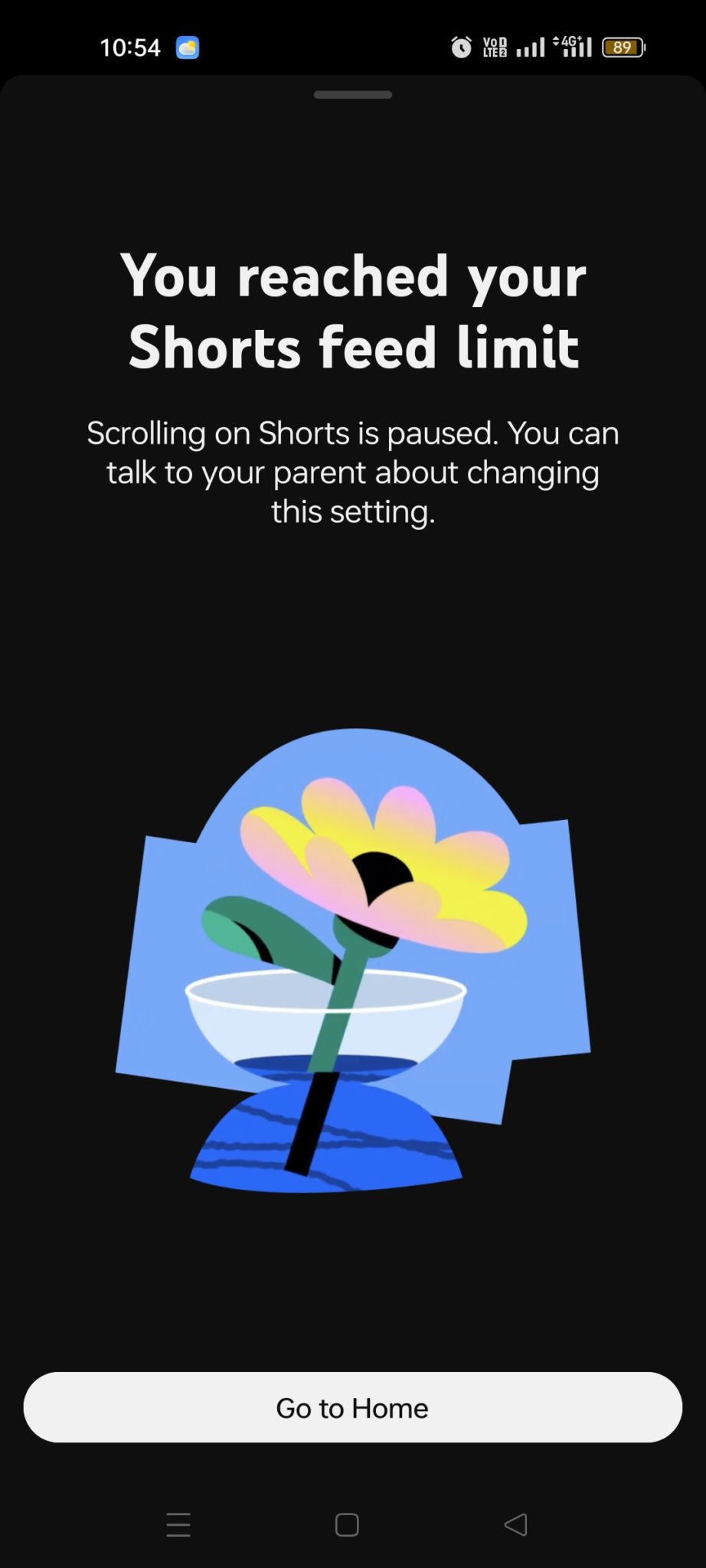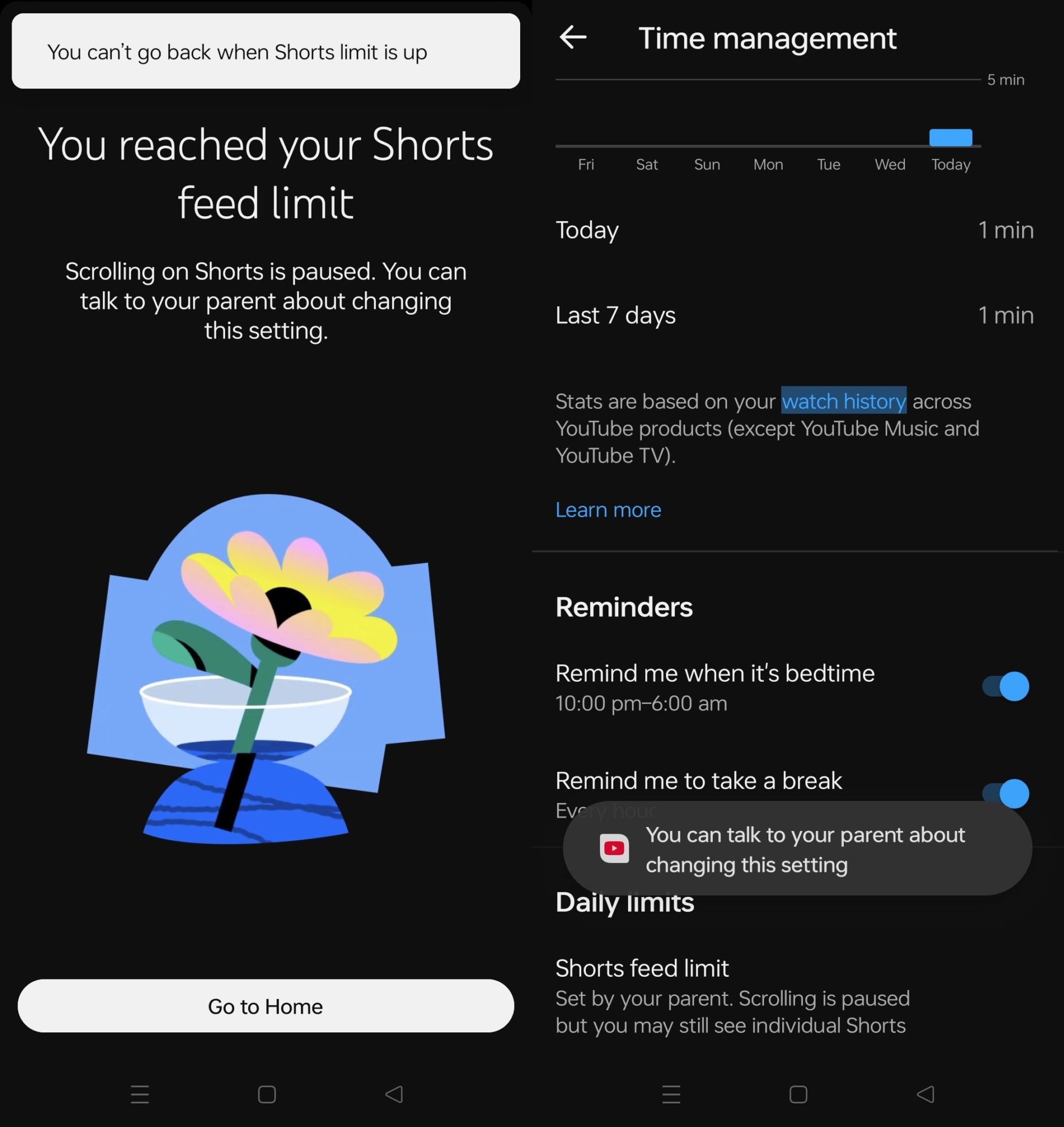 Selepas tetapan ini diaktifkan, apabila akaun kanak-kanak (bukan akaun ibu bapa) membuka Shorts, mereka akan melihat notifikasi bahawa had harian telah dicapai dan hanya diberikan pilihan “Go to home”.