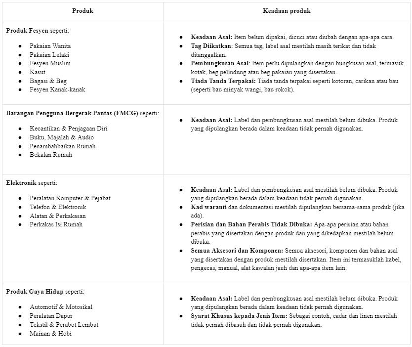 Walau bagaimanapun, produk yang layak perlu dipulangkan dalam keadaan yang baik dan memenuhi syarat tertentu, atau sebaliknya penjual berhak untuk menolak pemulangan barangan.