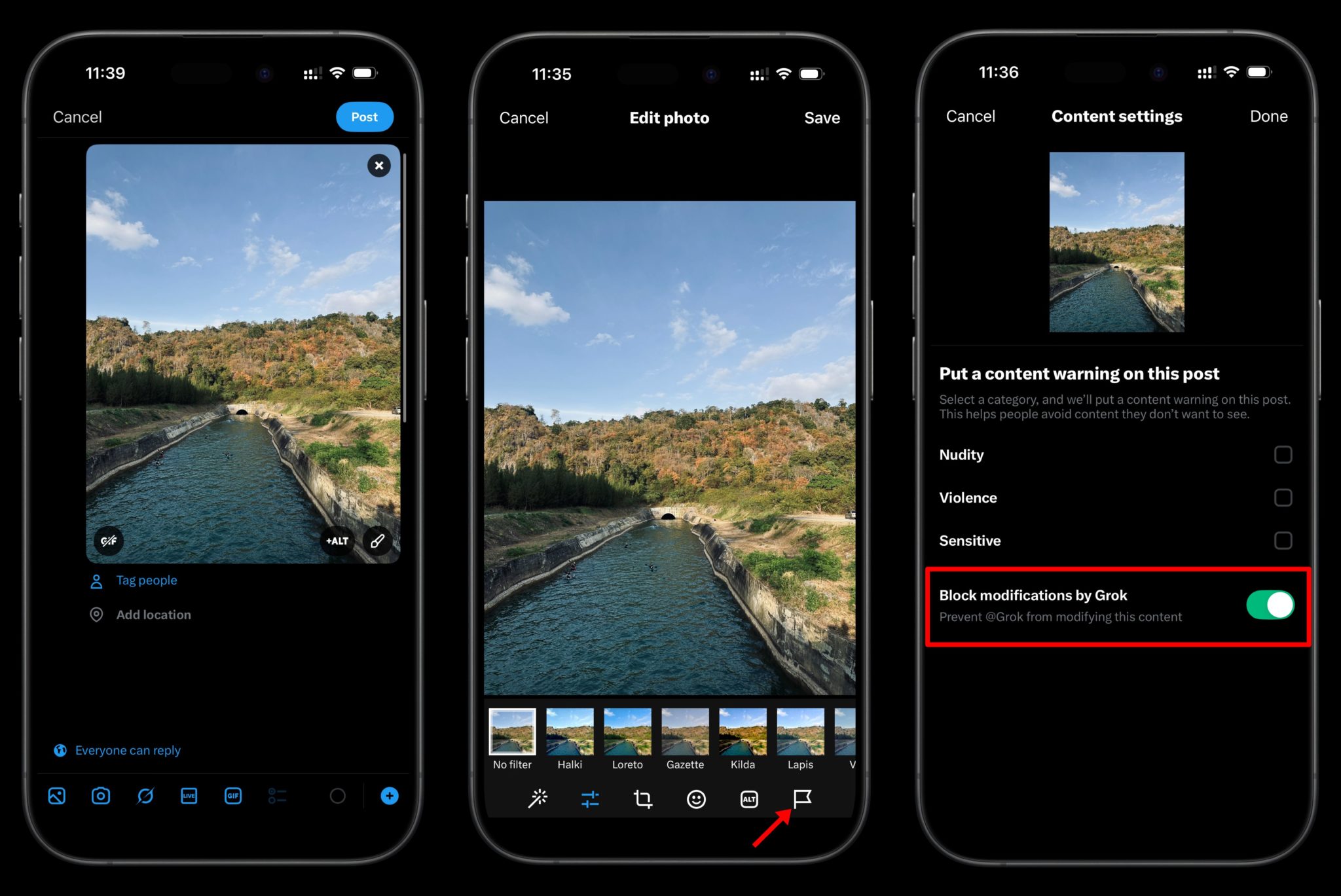 Apabila diaktifkan, ciri ini menghalang Grok daripada mengubah suai imej melalui satu kaedah tertentu, iaitu apabila akaun @Grok ditanda dalam ciapan balas bersama arahan untuk menyunting gambar.