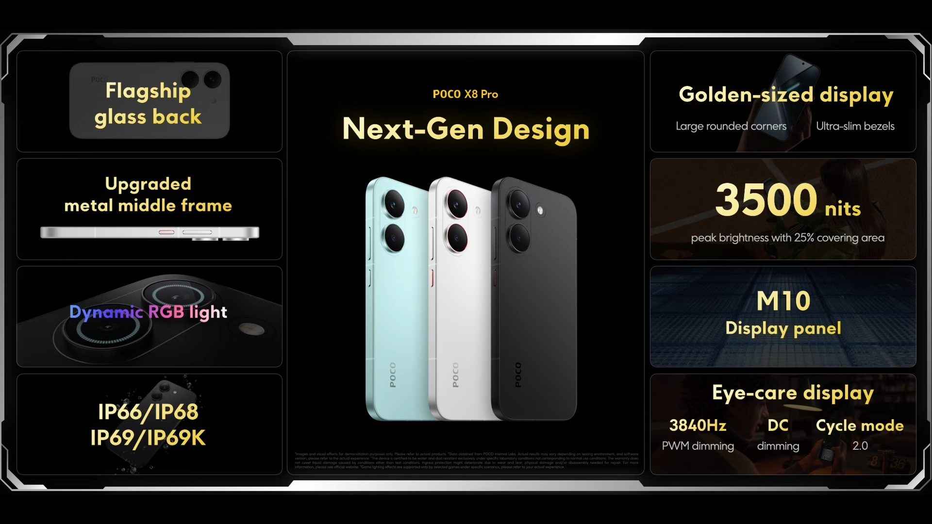 Dari segi paparan, siri ini dilengkapi skrin AMOLEDÂ dengan kadar segar semula 120Hz di mana POCO X8 Pro Max mempunyai paparan 6.83 inci, manakala POCO X8 Pro dilengkapi dengan paparan 6.59 inci,