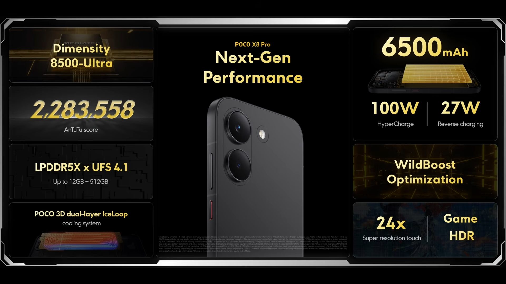 Bateri menjadi kelebihan utama dengan X8 Pro Max hadir dengan kapasiti 8,500mAh yang mampu bertahan sehingga dua hari, manakala X8 Pro menggunakan bateri 6,500mAh dengan sokongan pengecasan pantas 100W HyperCharge.