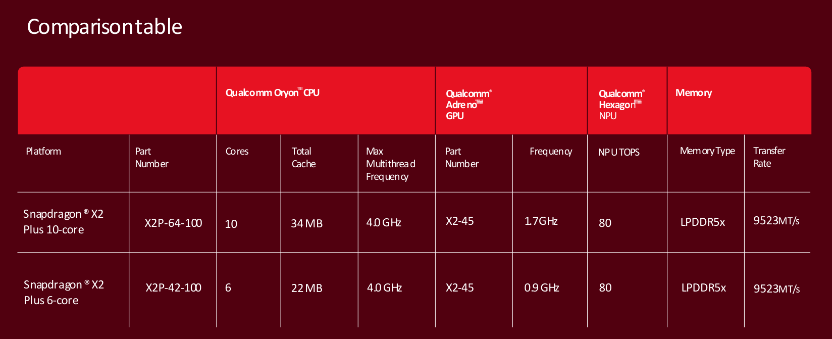 Snapdragon X2 Plus dibina pada proses 3nm dan menggunakan CPU Oryon generasi ketiga dengan kelajuan puncak sehingga 4.0 GHz. Qualcomm mengatakan CPU ini menawarkan prestasi teras tunggal sehingga 35% lebih pantas berbanding generasi sebelumnya, serta menggunakan 43% tenaga lebih rendah.