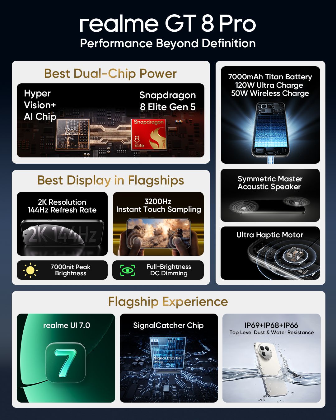 Secara ringkas, GT 8 Pro dikuasakan cip Snapdragon 8 Elite Gen 5, paparan 2K, kadar segar semula 144Hz serta kecerahan maksimum 7,000 nit.