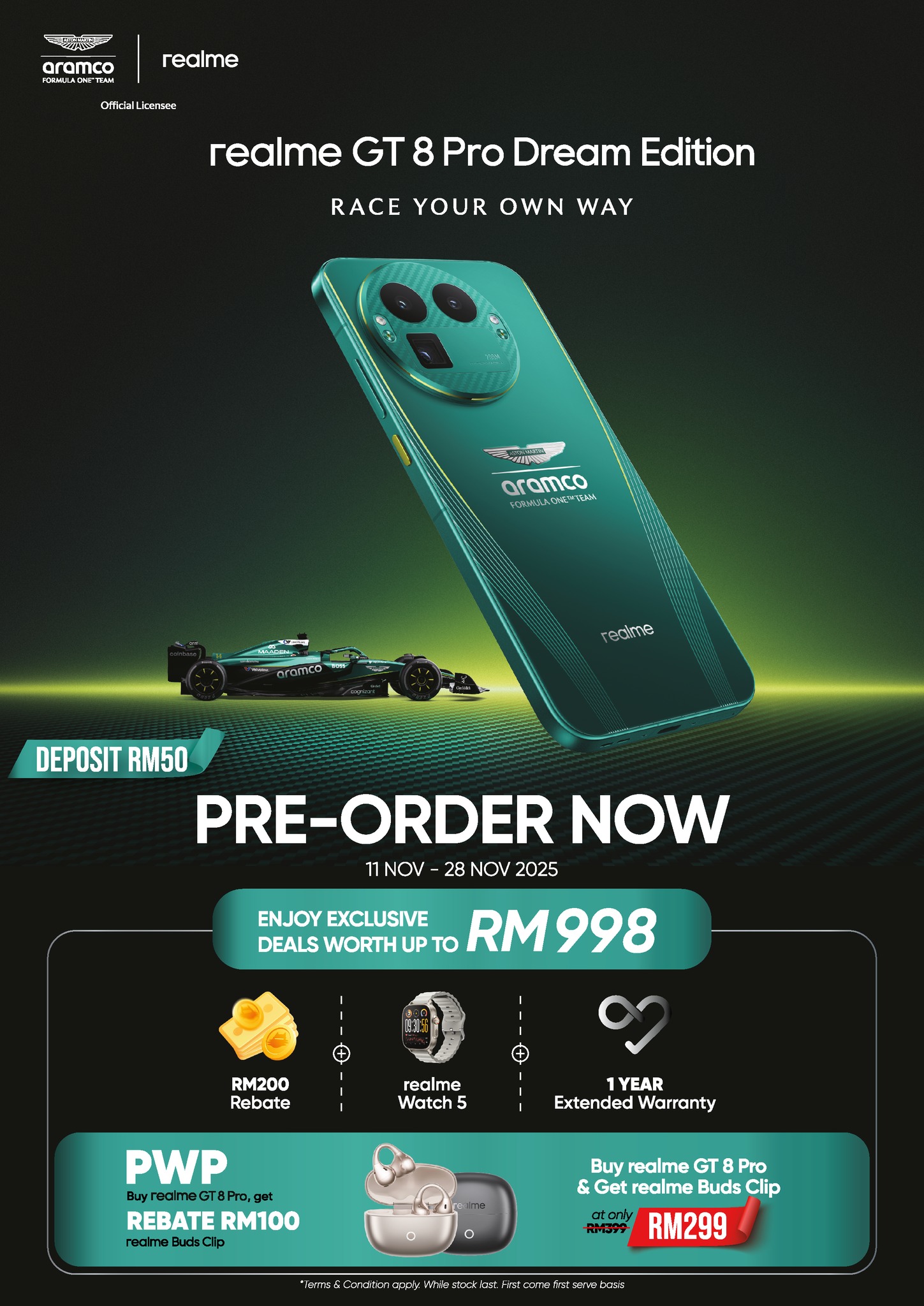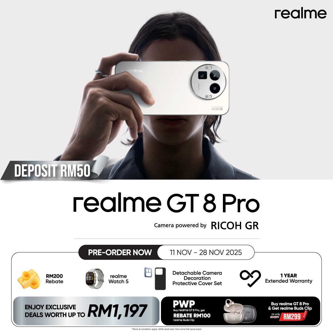 Seiring pengumuman tarikh pelancaran, prapesan untuk realme GT 8 Pro dan GT 8 Pro Dream Edition turut dibuka sehingga 28 November 2025, dengan deposit RM50.