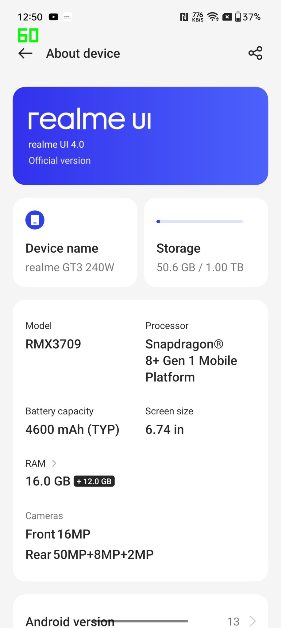 Ini adalah spesifikasi telefon pintar yang paling kompetitif dalam kelasnya kerana realme GT3 memberikan prestasi yang cukup berkuasa, memori yang pantas serta saiz storan yang cukup besar untuk penggunaan anda.
