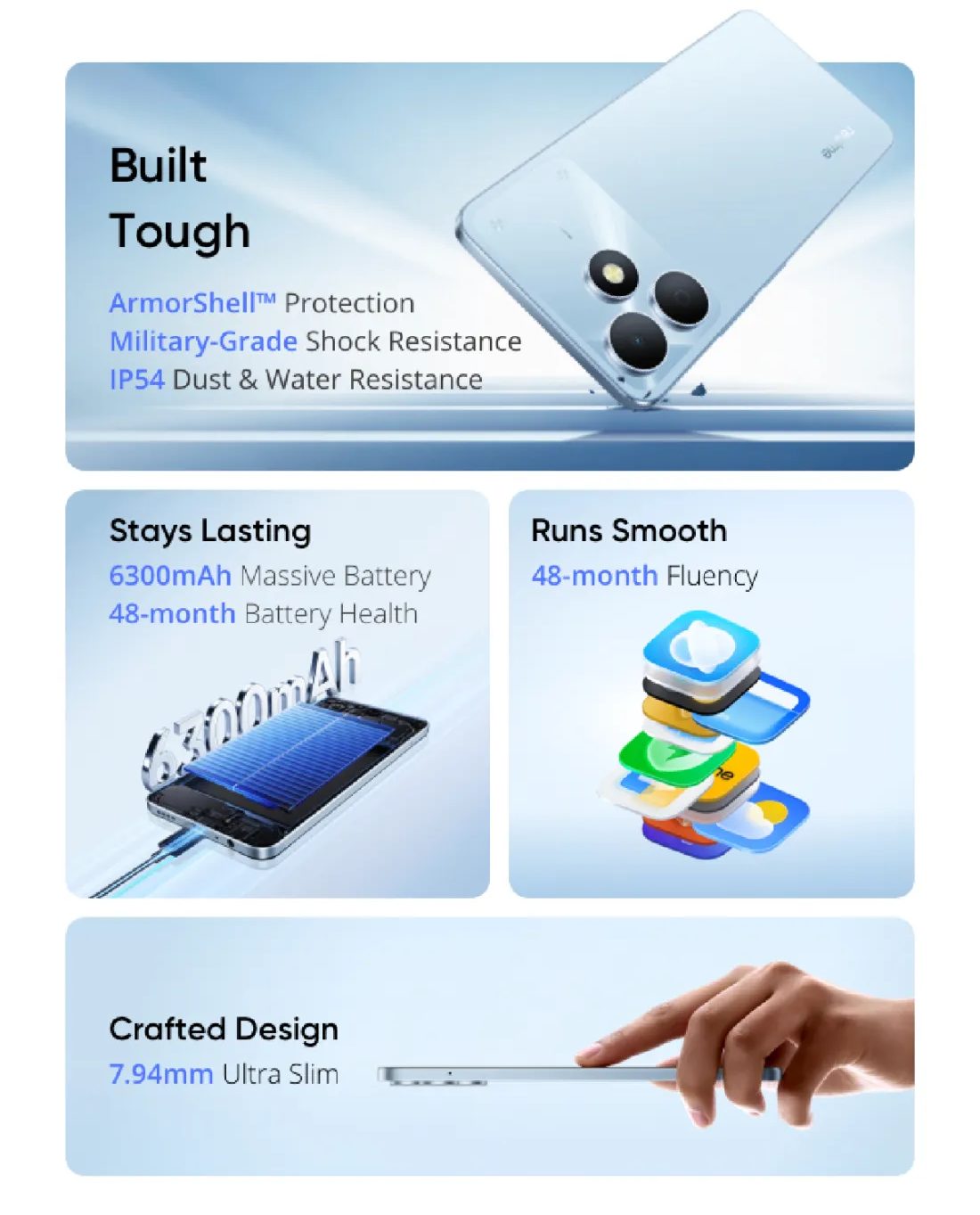 realme Note 80 menampilkan skrin 6.74-inci LCD HD+ dengan kadar segar semula 90Hz dan mempunyai ketahanan IP54. Peranti ini dikuasakan cip Unisoc T7250 dengan gandingan 4GB RAM LPDDR4X dan 64GB storan.