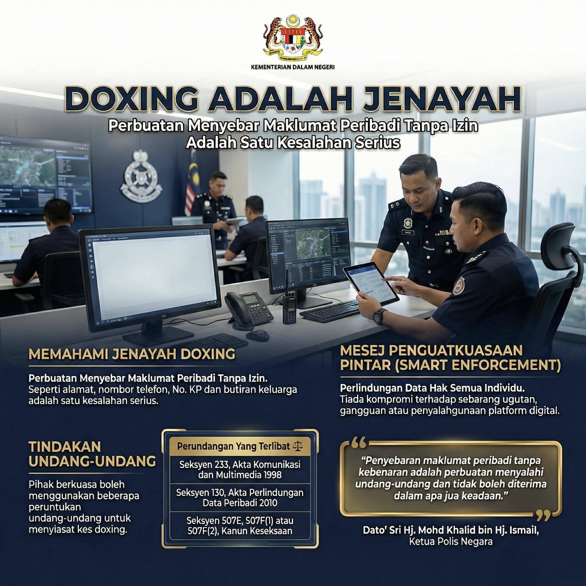 Ketua Polis Negara Datuk Seri Mohd Khalid Ismail menegaskan prinsip perlindungan data peribadi terpakai kepada semua individu tanpa mengira latar belakang, pandangan atau situasi semasa, serta tidak boleh dijadikan alasan untuk tindakan balas dendam, ugutan atau gangguan dalam talian.
