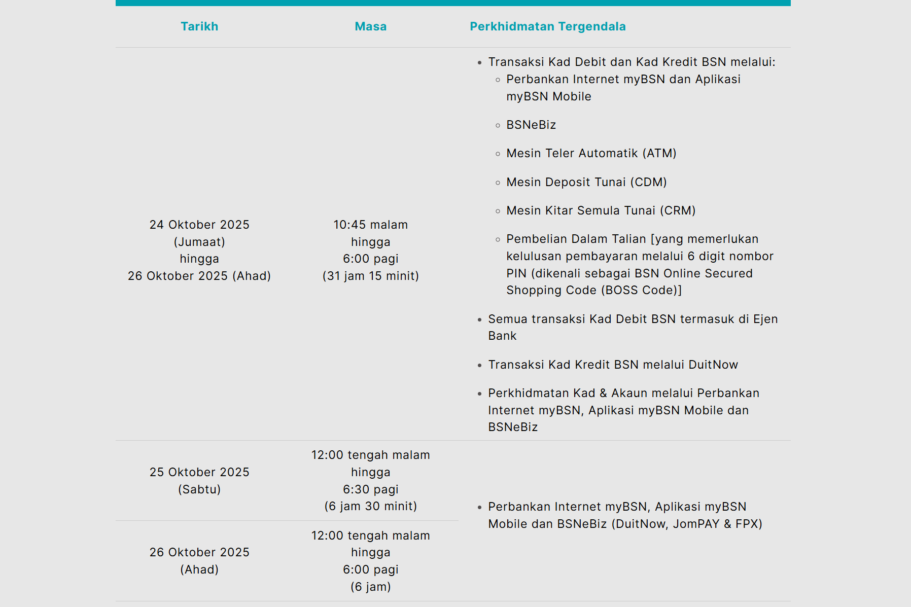 Dalam tempoh ini, perkhidmatan ATM, CDM serta kad debit BSN tidak dapat digunakan buat sementara waktu.