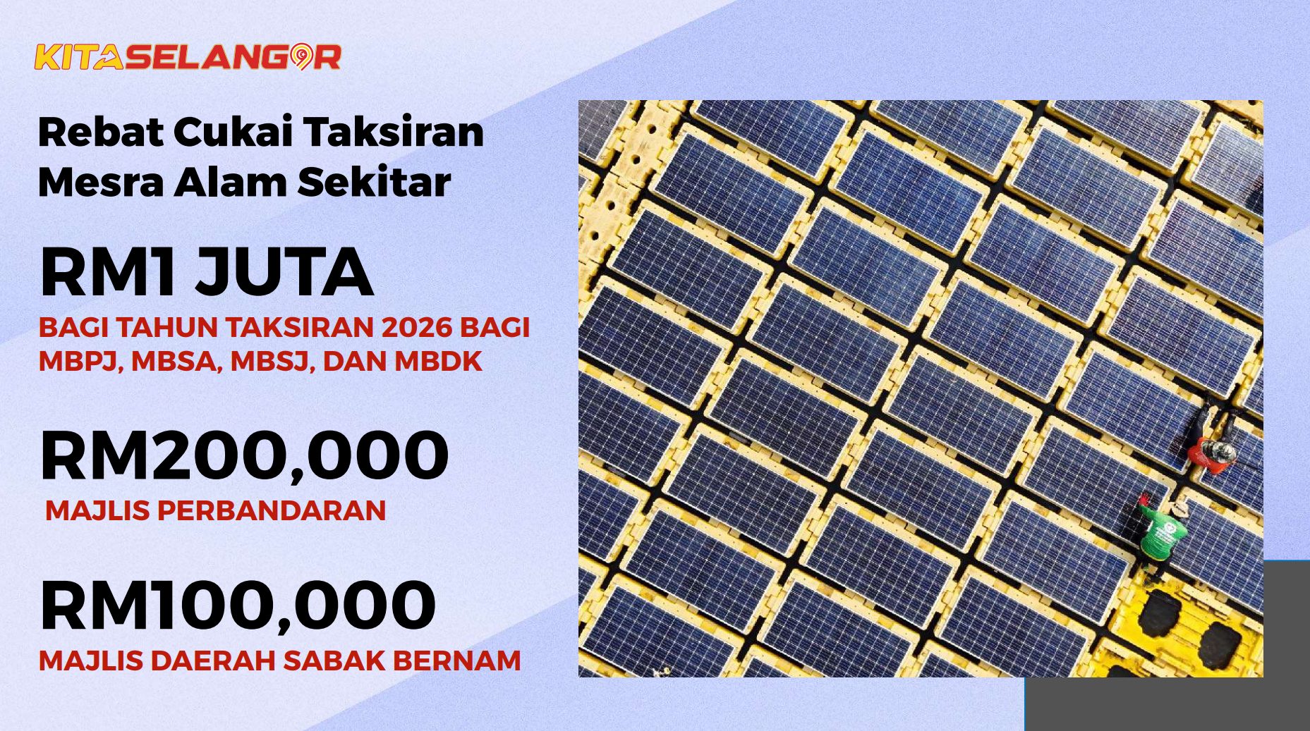 Menerusi Belanjawan 2026 Selangor, Menteri Besar Datuk Seri Amirudin Shari berkata penduduk negeri itu yang memasang semua fasiliti berkenaan akan menikmati sehingga 100% rebat cukai bagi tahun taksiran 2026 dengan memohon kepada PBT masing-masing serta melalui proses semakan.