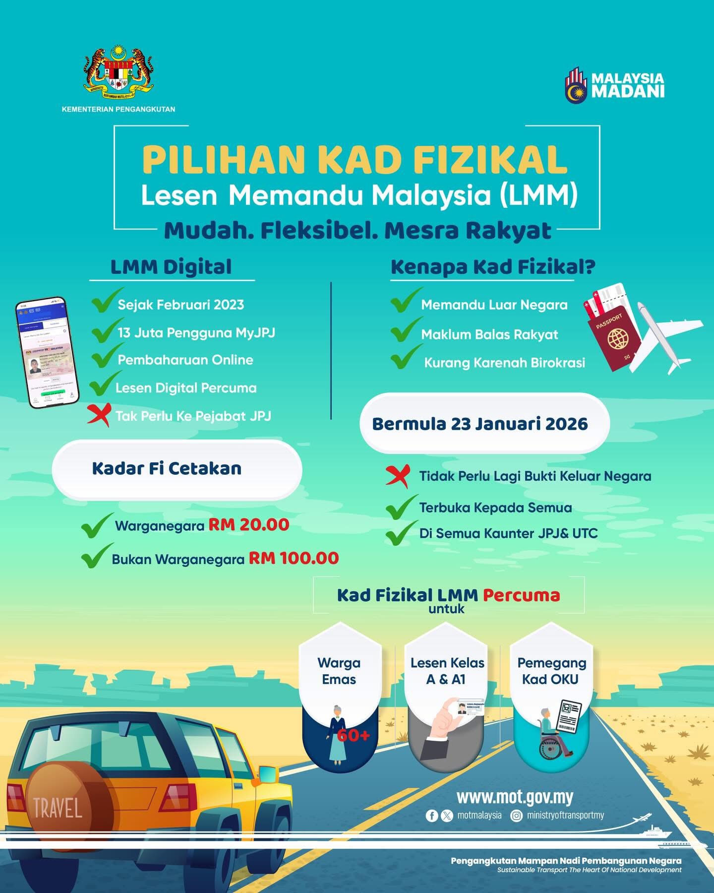 Semua pemegang Lesen Memandu Malaysia (LMM) kini boleh memohon cetakan kad fizikal tanpa keperluan menunjukkan sebarang bukti keluar negara, bermula 23 Januari 2026.