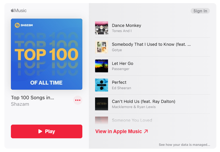 Lagu dengan bilangan pengecaman paling banyak ialah Dance Monkey oleh Tones and I, yang dikenal pasti lebih 45 juta kali oleh Shazam. Senarai 100 lagu terbaik Shazam boleh didengar melalui Apple Music.