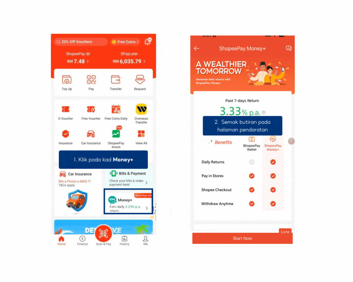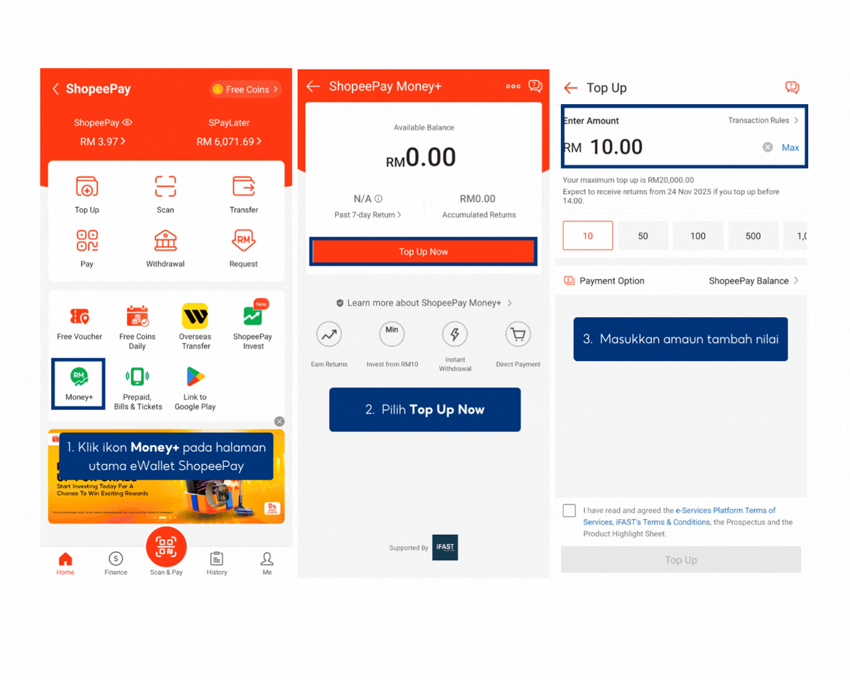 - Integrasi Lancar dengan ShopeePay: Baki Money+ akan digunakan secara automatik untuk tambah nilai ShopeePay eWallet sekiranya baki utama ShopeePay eWallet tidak mencukupi untuk transaksi.